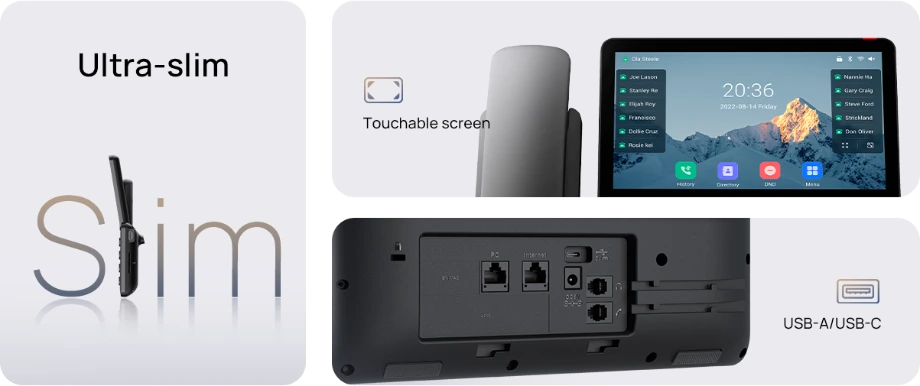 The Yealink SIP-T77U is a revolutionary, premium desk phone designed for executives and professionals who demand a fashionable, large-screen experience with intelligent audio and top-tier security. Featuring an all-new slim body, expansive 7-inch color touchscreen, dual USB ports (A + C), touchable interface, and a stand with two adjustable angles, the T77U delivers a modern, comfortable, and hygienic workspace solution.
